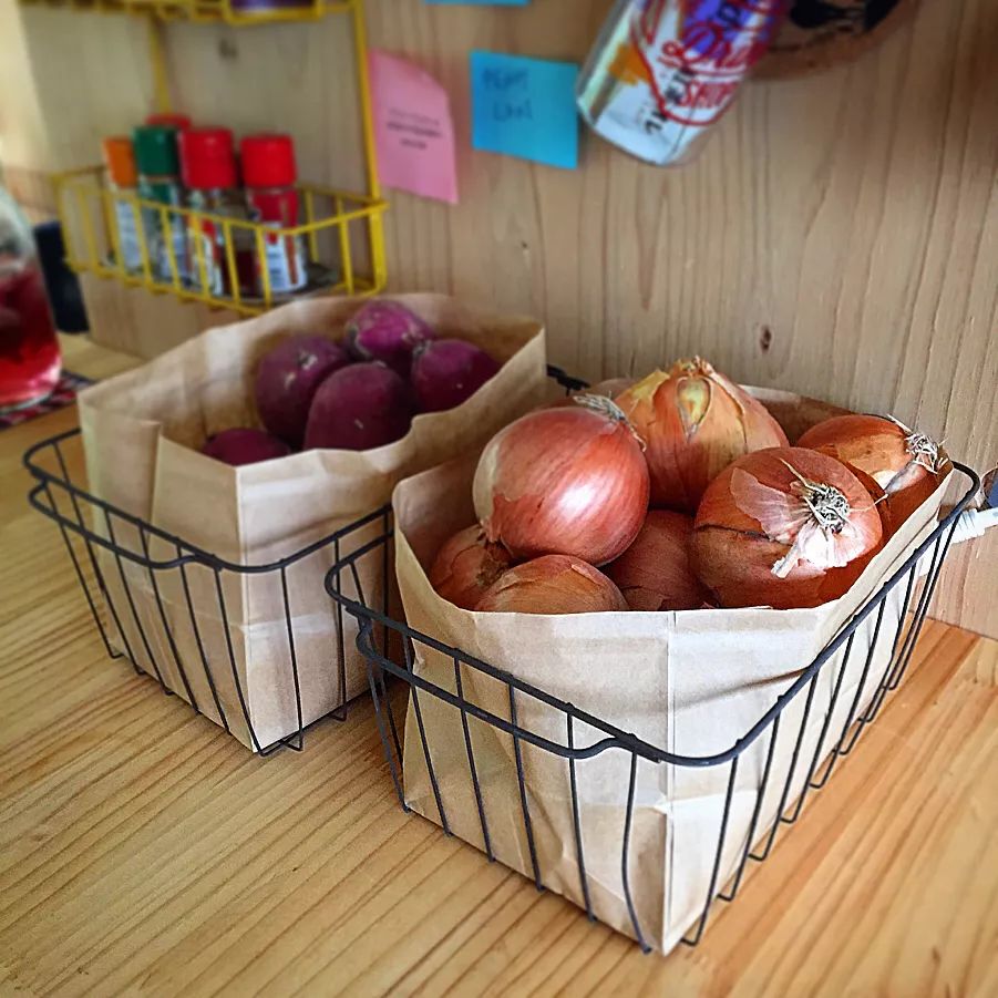 用纸袋和铁篮收纳长期储存的食物,可以挂起来保持食材干燥,延长食物的保质期。