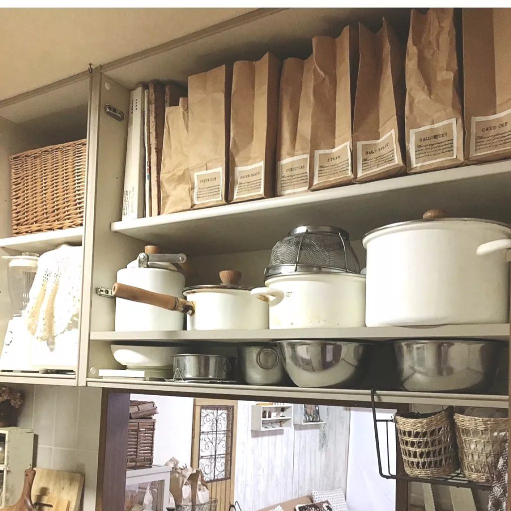 厨房不常用的物品,可以在纸袋上贴上标签收纳在橱柜上层。统一纸袋颜色会在视觉上更和谐哦~