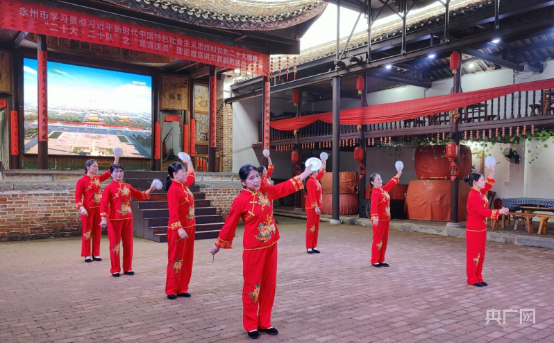 “不忘初心举中华,民族团结有力量。”田万载创新编排的碟筷舞《二十大精神到瑶寨》用接地气的瑶味土话唱词,以乡音传党音,引起现场观众共鸣,掀起活动高潮。