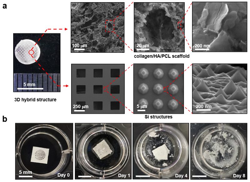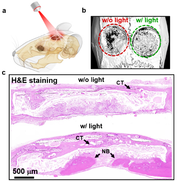 进一步,研究人员将薄膜单晶硅器件与羟基磷灰石等生物材料集成,制备了仿天然骨组织的三维生物支架,利用薄膜硅赋予支架光电活性,使其具备光电响应功能。在活体动物实验中,三维光电生物支架被植入大鼠颅骨缺损部位,利用支架的光电刺激作用,有效地促进了颅骨组织的修复与再生,完成了光电生物支架系统在生物医疗领域的验证与应用。